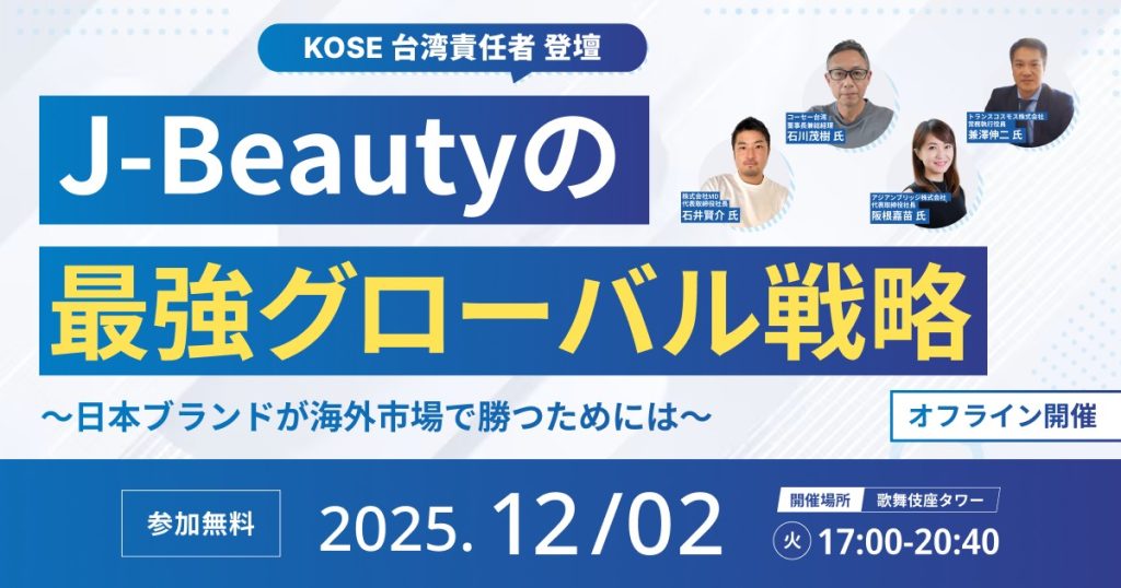 台湾やタイを始めとしたアジアへの進出を支援するアジアンブリッジ株式会社(本社:東京都千代田区)の代表 阪根嘉苗は、2025年12月2日(火)にオフラインセミナー「J-Beautyのグローバル戦略〜日本ブランドが海外市場で勝つためには。ブランド×製造×デジタル×チャネルの最適解〜」に登壇いたします。